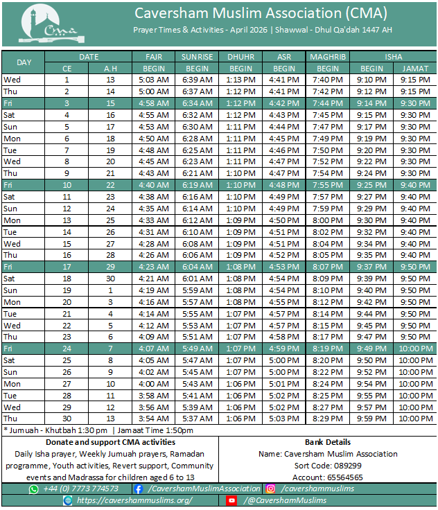 The Caversham Muslim Association (CMA) was established by Muslim residents of Caversham with the aim to promote Islam and the wellbeing of its followers.